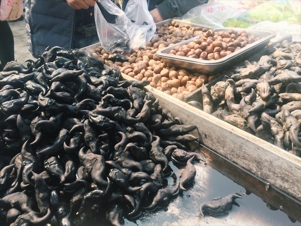蚰蜒,即墨特產(chǎn),樣子像是釣魚用的魚蟲,味道鮮美,因?yàn)椴荒苋斯ゐB(yǎng)殖,價(jià)格不低。蚰蜒炒雞蛋吃的當(dāng)?shù)刈钕矏鄣囊环N吃法。ps,小編沒(méi)敢品嘗,據(jù)同伴說(shuō)肉質(zhì)鮮嫩···
