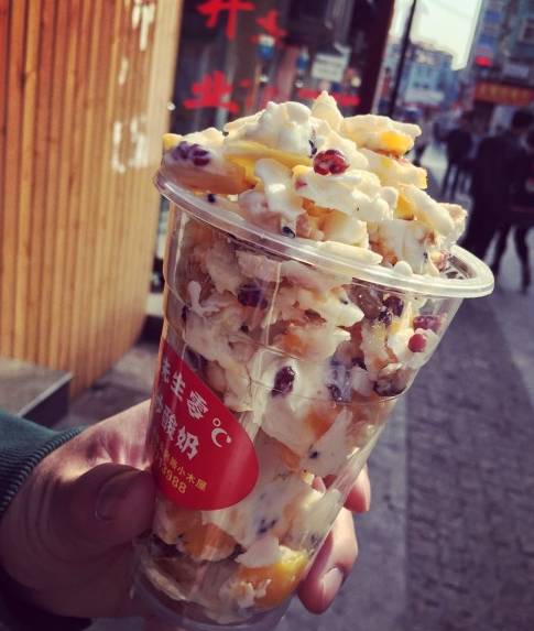 只有一個(gè)小窗口,可以看見(jiàn)里面炒酸奶的全過(guò)程哦!店里有兩種酸奶,一種是原味的,一種是莫斯利安酸奶,里面放了很多紅豆,葡萄干,花生碎,芝麻等等的,吃起來(lái)特別香特別爽,和冰淇淋相比,熱量低很多,所以非常適合減肥的妹子!