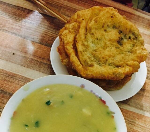 青島港上有名的早餐,聽(tīng)說(shuō)每天都要排很長(zhǎng)的隊(duì),風(fēng)雨無(wú)阻!餡餅有蘿卜跟肉餡兩種、肉餡比較有味道,提前腌過(guò)的,蘿卜就比較清淡一些~甜沫很濃厚,這點(diǎn)給贊。里面有花生仁,豆腐干,肉,還有菜葉子,配著餡餅,非常帶勁。
