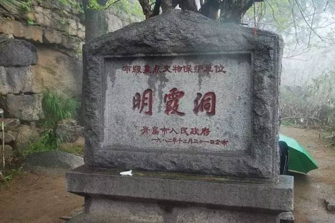 洞前平崖如臺(tái),由此遙望大海,空蒙浩渺;俯視崖下,溝壑縱橫。嶗山勝景“明霞散綺”即此。