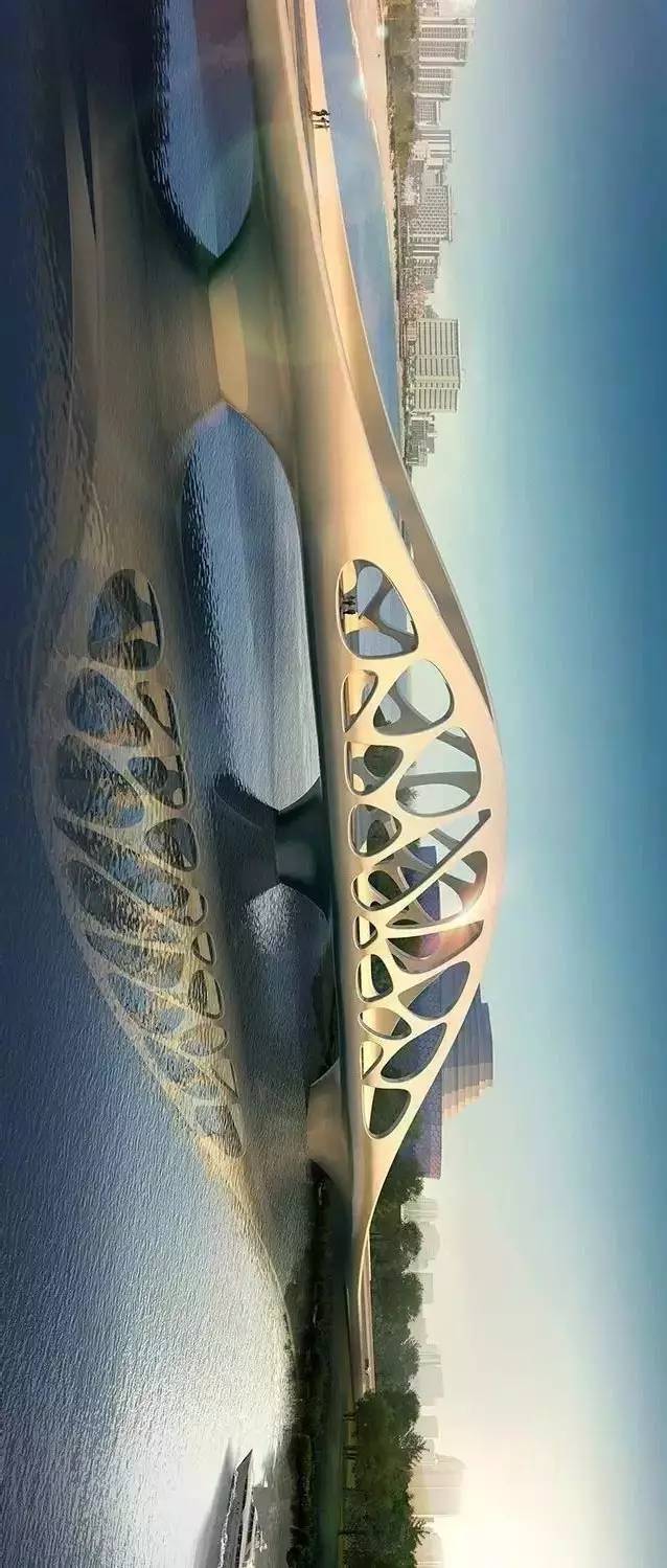 珊瑚貝橋的設(shè)計靈感來自海洋,橋身整體造型猶如海面上躍起的海豚,橋與海面的倒影又像貝殼,橋身的鏤空圖案概念源于珊瑚的抽象圖形。