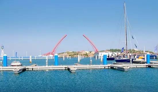 橋下有特大型船舶進(jìn)港時,電動液壓裝置可將橋身分為南北兩段向上開啟,開啟后猶如兩葉30米高鼓風(fēng)待航的風(fēng)帆,成為海灣一道美景。