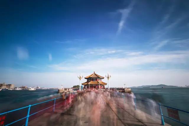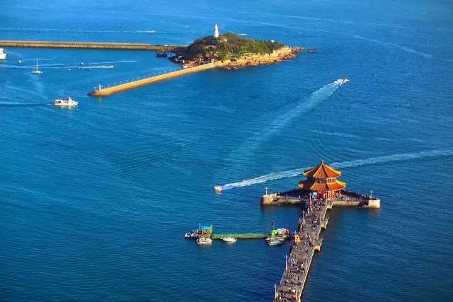 棧橋是青島歷史的見證,棧橋是青島的象征。游人漫步于棧橋海濱,可見青島外形如彎月,棧橋似長虹臥波,回瀾閣熠熠生輝。所謂“長虹遠(yuǎn)引”、“飛閣回瀾”所指即此。