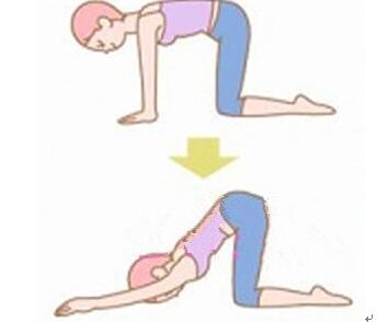2、同樣是手臂、上身、大腿、小腿互成角度地俯身跪地,左手離地放在頭部的左側(cè)。然后往左扭轉(zhuǎn)上身,保持雙膝、小腿、右手著地,緩緩呼氣,在左右互換。