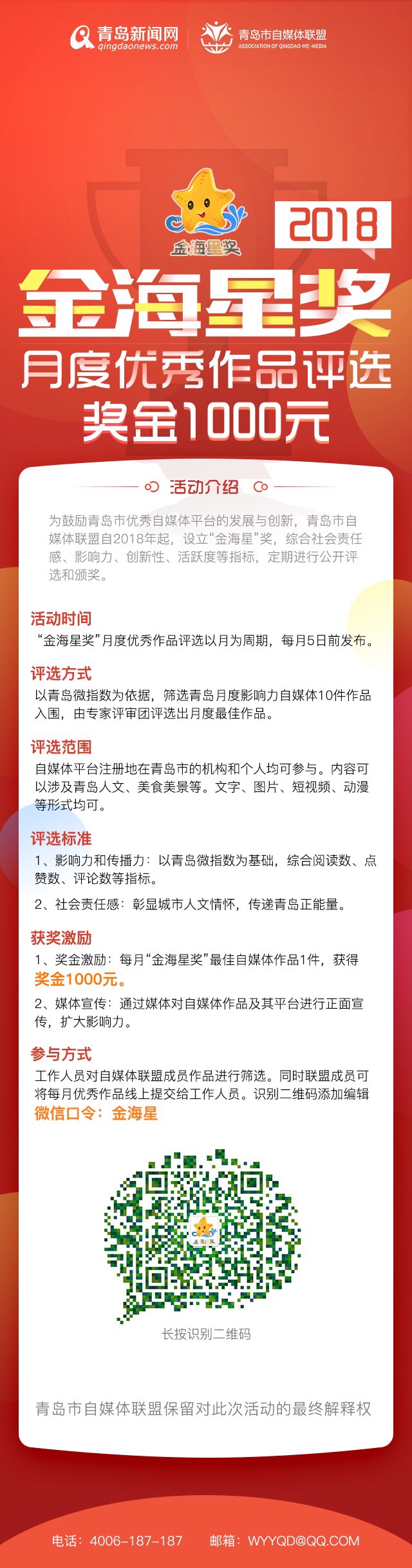 三、評選范圍:自媒體平臺注冊地在青島市的機構(gòu)和個人均可參與。內(nèi)容可以涉及青島人文、美食美景等。文字、圖片、短視頻、動漫等形式均可。