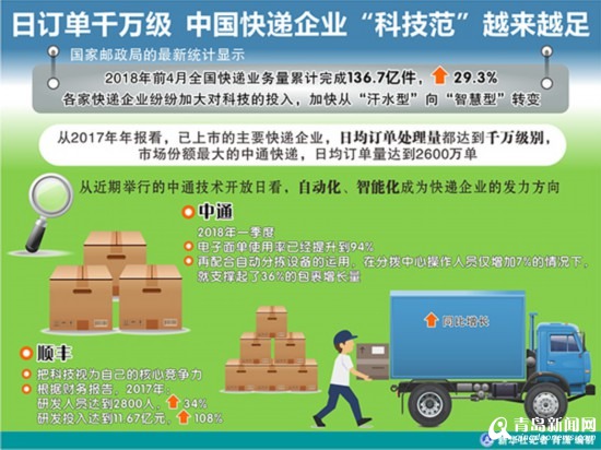 國家郵政局的最新統(tǒng)計顯示,今年前4月全國快遞業(yè)務量累計完成136.7億件,同比增長29.3%。支撐近30%的增速,各家快遞企業(yè)紛紛加大對科技的投入,加快從“汗水型”向“智慧型”轉(zhuǎn)變。