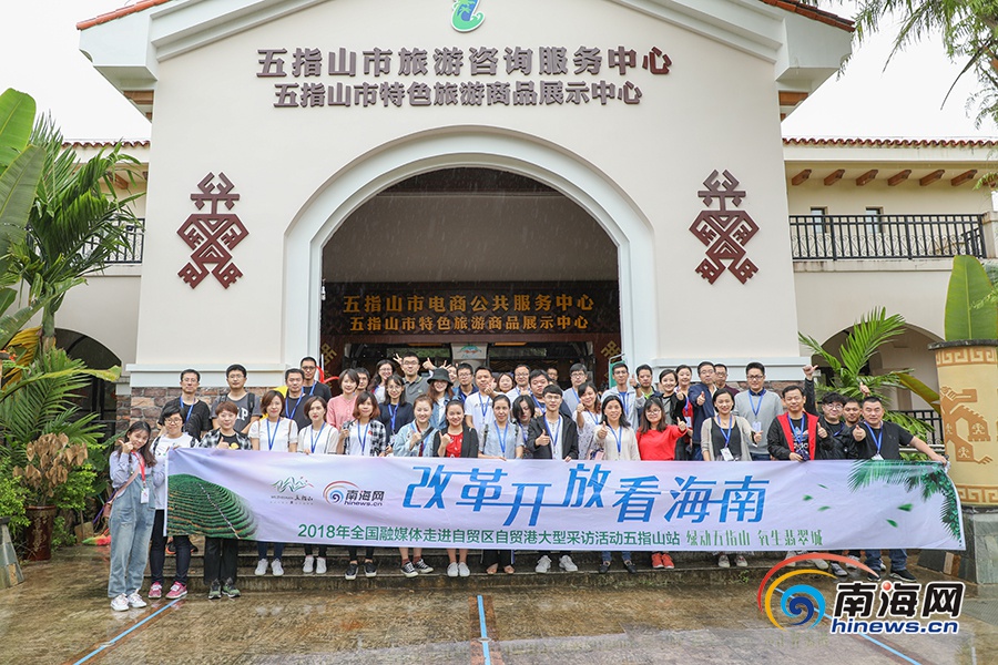 “改革開(kāi)放看海南”2018年全國(guó)融媒體海南行大型采訪團(tuán)在五指山市電子商務(wù)公共服務(wù)中心合影留念。南海網(wǎng)記者李昊攝