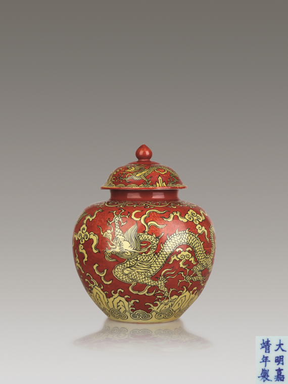 嘉靖款的礬紅龍紋蓋罐,高26.5cm,此罐造型敦實(shí)而秀潤(rùn),蓋口沿下弧收,為天蓋地式寶珠頂蓋,全器以礬紅彩為色地,以黃彩繪畫(huà)紋飾。蓋面紋飾為福山壽海云龍紋,腹部主題紋飾亦為云龍紋駕騰于壽山福海之上,筆意瀟灑恣肆,云龍古拙可愛(ài).黃紅二彩相配得宜,對(duì)比強(qiáng)烈。底部圈足內(nèi)均施白釉,厚潤(rùn)瑩美,中心青花料書(shū)“大明嘉靖年制”六字雙行楷書(shū)款。