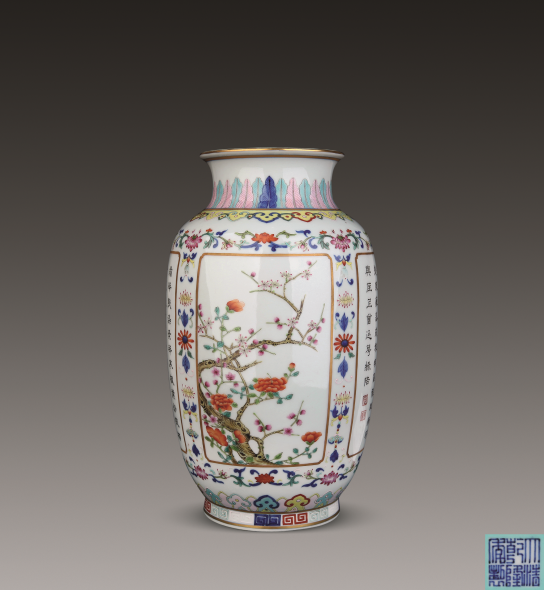 大清乾隆年制粉彩開(kāi)光詩(shī)文花卉燈籠尊,高31cm,這款粉彩燈籠瓶造型莊重典雅、外繪粉彩花卉詩(shī)文圖案,內(nèi)施松石綠釉,通體層次分割及開(kāi)光邊欄用描金點(diǎn)綴,瓶腹采四道開(kāi)光式窗口、飾以御制詩(shī)和四時(shí)花卉。題詩(shī)字體端麗秀逸、排列工整、與花卉紋飾對(duì)照分明?;ㄆ渴┯载S潤(rùn)亮澤、色彩紛呈華美異常,制作水平之高可稱作乾隆時(shí)期代表之作。底部落款“大清乾隆年制”六字青花款。