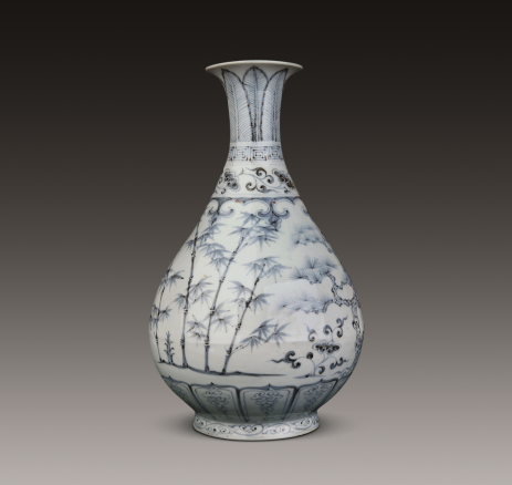 明洪武青花松竹梅紋玉壺春瓶,高32.5cm,此件玉壺春瓶細(xì)頸,圓腹,圈足。青花飾紋自上而下共分六層,依次為蕉葉紋、回紋、卷草紋,腹部主題紋繪三友圖,取象征清高、寓意吉祥之物三種組成畫(huà)面。合而謂之“歲寒三友圖”。近底處繪蓮瓣紋,圈足外繪卷草紋。此器造型端莊挺拔,胎體厚重,釉汁肥潤(rùn),紋飾布局疏朗,畫(huà)工流暢。