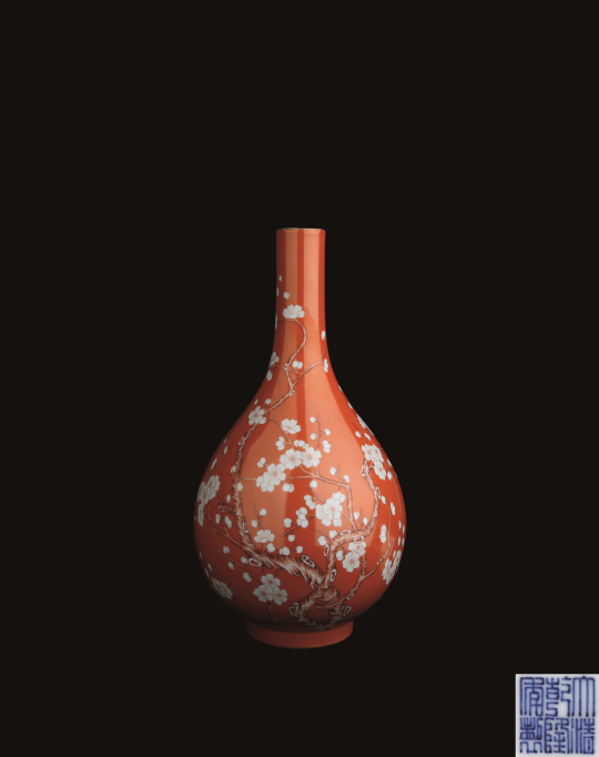 乾隆款的珊瑚紅梅花瓶,高30.5cm,因其外形酷似懸膽而得名。細(xì)長(zhǎng)頸,垂腹,圈足,平底。施珊瑚紅釉,上繪礬紅梅枝蒼勁有力,反白梅花落英繽紛分外妖嬈。釉質(zhì)堅(jiān)致細(xì)密,撫之如玉,細(xì)膩如脂,釉色瑩潤(rùn)亮澤,鮮麗奪目,寶氣光華,造型雋美挺拔,線條流暢,保存良好,殊屬罕見(jiàn),堪稱朝官窯精品佳作。底部“大清乾隆年制”青花六字篆書(shū)款。