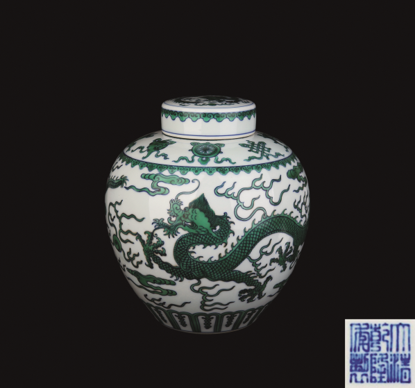 清乾隆款的綠彩龍紋蓋罐,高20.5cm,此罐直口矮頸,豐肩鼓腹,小底內(nèi)挖式圈足,造型規(guī)范做工精良雍容典雅,全器通體施白釉清透肥潤(rùn),釉下青花為范上繪綠彩龍紋裝飾,給人以清新雅致之感,口沿底部繪兩道青花弦紋,肩部為佛教八吉祥紋,分別為輪、螺、傘、蓋、花、瓶、魚(yú)、結(jié),下垂云頭紋,腹部綠釉繪趕珠游龍,四周圍繞“山”字火紋。底足書(shū)“大清乾隆年制”青花篆書(shū)方款。