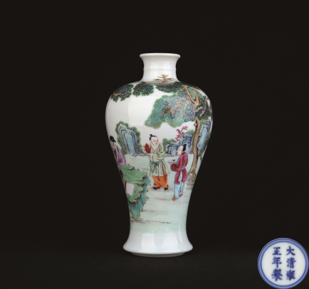 清雍正時(shí)期的粉彩人物故事紋梅瓶,高21cm,造型規(guī)范,唇口,頸部,美人肩,鼓腹內(nèi)收,圈足。腹部粉彩繪人物,線條描繪清晰,人物形象生動(dòng),顏色亮麗,畫(huà)工精細(xì)。此器物胎白,通體以白釉為地。外底署青花楷體“大清雍正年制”六字三行款外圍雙圈。