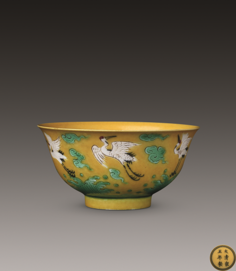 清雍正的黃釉暗刻仙鶴海水紋碗,深10.5cm,此碗工藝精到,端莊典雅,是雍正當(dāng)朝創(chuàng)新品種,雍正十三年督陶官唐英撰《陶成紀(jì)事》中提到“新試澆黃五彩器皿”即指此類黃地粉彩器,底心書(shū)“大清雍正年制”六字二行青花楷書(shū)款。