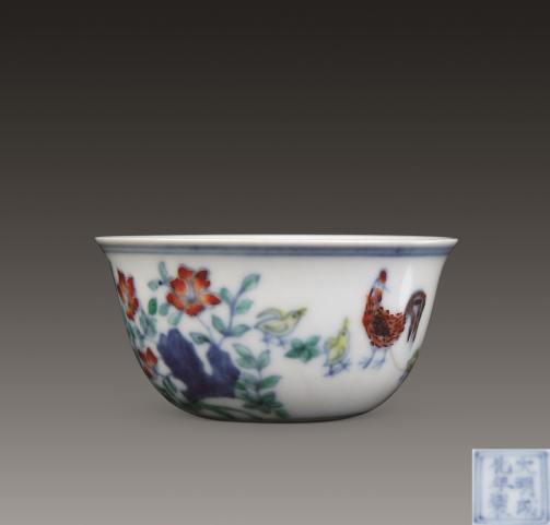 明成化的斗彩雞缸杯,高8.1cm,成化斗彩雞缸杯為明代成化皇帝的御用酒杯,燒造時(shí)因帝王之家的高要求,成品率極低,上品供奉宮廷,次品則被銷毀,因而流傳到民間的數(shù)量極少。此雞缸杯以清新可人的造型、精致的工藝而歷受贊賞,堪稱明成化斗彩器之典型。本杯器底心有傳世使用驚釉碎開(kāi)片,底心青花雙方欄內(nèi)楷書(shū)“大明成化年制”雙行六字款。
