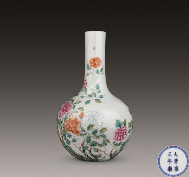 雍正款的粉彩花卉天球瓶,高34.5cm,此器瓶微撇口,長(zhǎng)頸,圓鼓腹,圈足。渾厚圓潤(rùn),繪工細(xì)膩婉麗,富麗堂皇。是清代雍正粉彩官窯瓷器代表之作,無(wú)論胎釉、造型、繪制、款識(shí)均一絲不茍,無(wú)可挑剔。通體飾粉紅、淡黃、粉白及礬紅牡丹花叢,色彩搭配巧妙,呈色均勻淡雅而不失華美。底足書(shū)青花“大清雍正年制”六字楷書(shū)款。