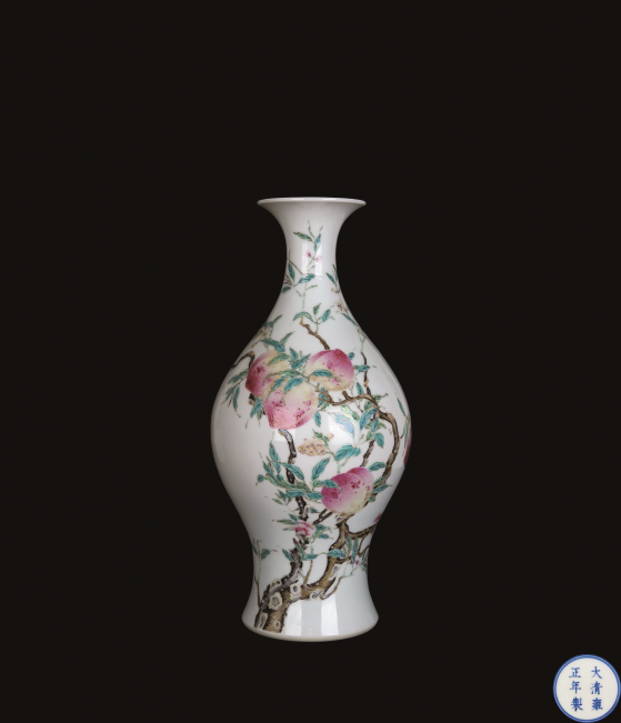 雍正時(shí)期的粉彩壽桃紋橄欖瓶,高34cm,胎體潔白,釉色滋潤(rùn)。瓶身呈橄欖形,造型線條流暢優(yōu)美。瓶體上用粉彩畫(huà)著八顆壽桃和兩只蝙蝠,壽桃象征“長(zhǎng)壽”,蝙蝠與“?!敝C音。此粉彩蝠桃紋橄欖瓶出產(chǎn)于雍正景德鎮(zhèn)官窯,代表了整個(gè)清代粉彩的制作水平。據(jù)考證,這種瓷器乃帝王后妃做壽之用,屬特殊宮廷喜慶活動(dòng)訂燒精品。底款“大清雍正年制”青花六字款。