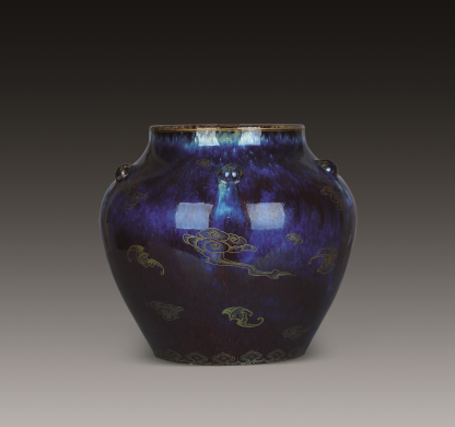 乾隆款窯窯變釉描金鼓釘罐,高18.5cm,此罐器型以宋瓷鼓釘罐為原型,形制規(guī)整,工藝考究,古意盎然,仿鈞窯窯變釉紫紅泛藍(lán)深沉靜穆,釉面晶瑩亮麗玻璃光質(zhì)感強(qiáng)烈,上繪描金祥云蝙蝠如意圖案,象征著洪福齊天吉祥如意美好愿望。底部“大清乾隆年制”六字青花篆書(shū)款。