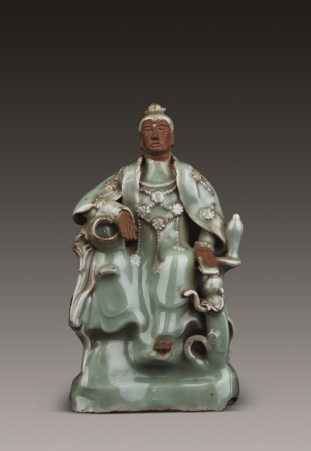 南宋龍泉窯青釉男相觀音座像,高20.8cm,觀音面部表情平靜慈祥,雙眸微垂,神態(tài)凝重端詳,胸口及雙臂飾有瓔珞紋飾,臉、手、腳局部呈露胎的褚紅,呈肌膚色,與整體的青釉形成強(qiáng)烈的對(duì)比,讓人印象深刻。造像施粉青釉,釉水肥厚色澤青翠,溫潤(rùn)如玉。采用了龍泉窯常用的雕塑,模印、露胎等工藝技法于一體,并表達(dá)的淋漓盡致,特色鮮明,古樸典雅,美輪美奐彌顯珍貴。