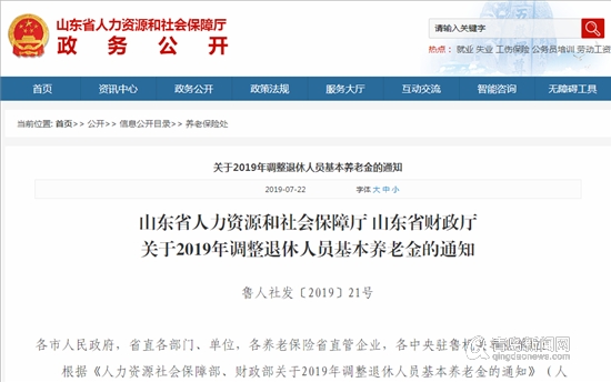 青島新聞網(wǎng)7月22日訊 (記者 張萍)今天,青島新聞網(wǎng)記者從山東省人力資源和社會保障廳官網(wǎng)獲悉,日前,《關(guān)于2019年調(diào)整退休人員基本養(yǎng)老金的通知》正式印發(fā),確定從2019年1月1日起調(diào)整退休人員基本養(yǎng)老金。這是我省自2005年以來連續(xù)第15年調(diào)整企業(yè)退休人員養(yǎng)老金,也是繼2016年之后連續(xù)第4年統(tǒng)一安排、同步調(diào)整企業(yè)和機關(guān)事業(yè)單位退休人員待遇。