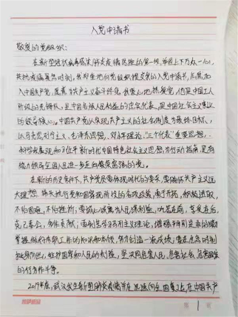 在基層防疫第一線,30余名青年同志鄭重向黨組織遞交入黨申請書,莊嚴地立下了“請黨組織在防疫戰(zhàn)斗中考驗我”的入黨誓言。
