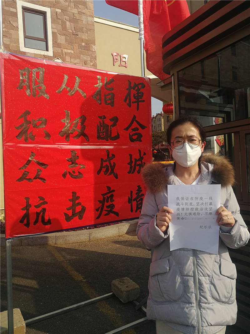 “看到社區(qū)那么多黨員同志身先士卒,加入社區(qū)抗疫黨員先鋒隊,自覺主動戰(zhàn)斗在抗疫第一線,我深受感動和鼓舞。我想與他們一道,為堅決打贏疫情防控阻擊戰(zhàn)貢獻我的年輕力量?!?3年出生的紀樂樂是流亭街道西后樓社區(qū)的一名工作人員。自疫情發(fā)生以來,她積極響應社區(qū)黨組織號召,主動參與到社區(qū)疫情防控工作中來。在執(zhí)勤卡口,她拿著溫度計一遍遍為進出人員檢測體溫。室外溫度冷,容易造成測量誤差,她就把溫度計揣進懷里,確保檢測不出問題。深夜兩點,紀樂樂還在整理人員排查信息,連抽空吃一口泡面、打個盹都成為了一種“奢侈”。她卻說“疫情面前,必須分秒必爭,我要在防疫一線戰(zhàn)斗到底!無懼艱險,不辱使命!”