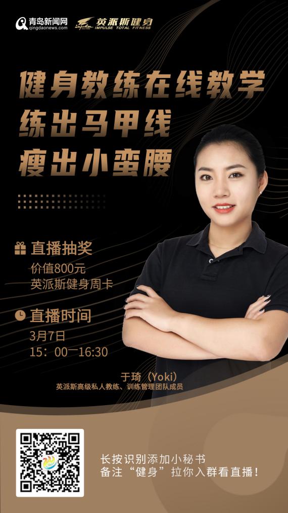 青島新聞網(wǎng)3月5日訊 生命在于運(yùn)動(dòng),一場(chǎng)疫情讓越來(lái)越多的人意識(shí)到提高身體免疫力的重要性,但眼下健身房不開(kāi)門(mén)、家里運(yùn)動(dòng)缺器械、自己練習(xí)沒(méi)章法,宅在家里該怎么健身呢?別著急!3月7日(本周六)15:00,來(lái)自英派斯健身的明星美女教練將上線,屆時(shí)我們就可以跟隨主播的鏡頭,一起學(xué)習(xí)居家健身小竅門(mén),還能邊看直播邊參與抽獎(jiǎng)!讓我們一起動(dòng)起來(lái),在家練出馬甲線、瘦出小蠻腰,從此告別大肚腩!