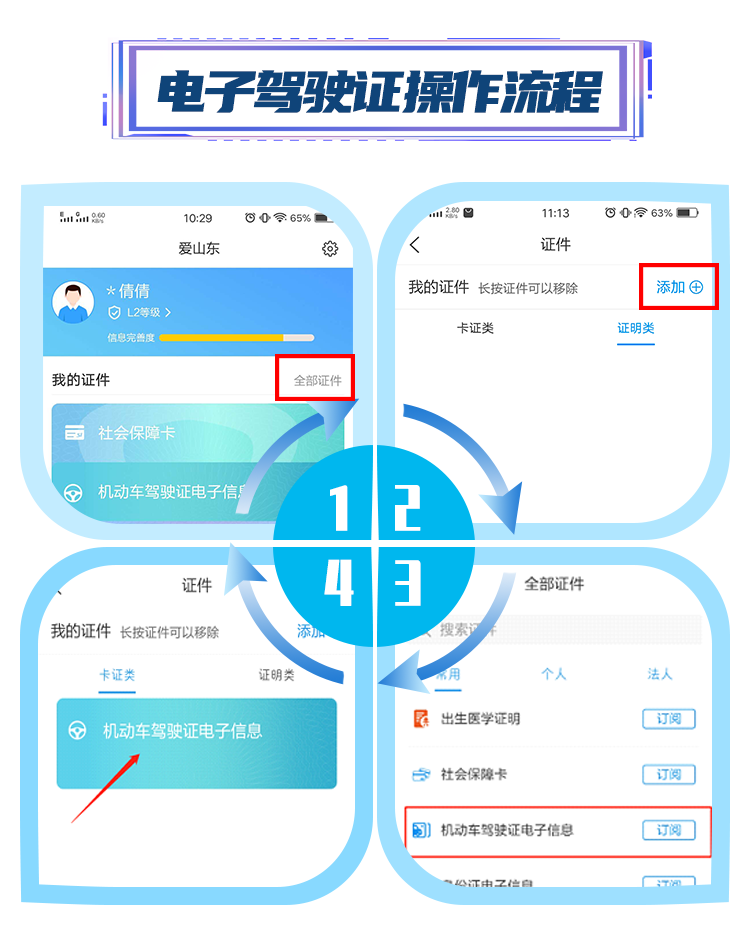 拿出手機,打開“愛山東”首頁,由“我的證件”進入,即可綁定機動車駕駛證及身份證電子信息,給路上檢查的交警小哥出示——耶!輕松通過。