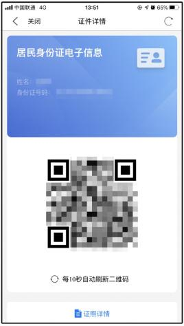 (3)完成實名認(rèn)證后可重新進(jìn)入“身份證電子信息”功能,完成人臉識別信息確認(rèn),即可生成個人身份證電子信息。使用時,可以打開網(wǎng)證二維碼,通過掃一掃證明自己的身份,點擊“證照詳情”即可顯示身份信息。