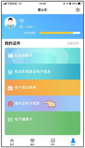 “居民身份證電子信息”與實體身份證證面信息完全一致,在需要核實身份時,征得核驗方同意,即可替代實體身份證使用。目前領(lǐng)取方式非常便捷,居民只需通過“愛山東”APP點擊“我的證件”,根據(jù)提示完成刷臉等身份認(rèn)證,即可查看自己的“居民身份證電子信息”。