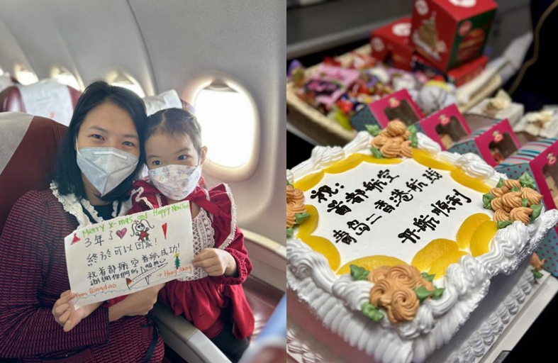 用糖果傳遞平安祝福,用蛋糕分享開航喜悅,活動最后,乘務員將開航蛋糕推入客艙,與所有旅客一同分享了首都航空青島=香港客運航線開通的喜悅與祝福。