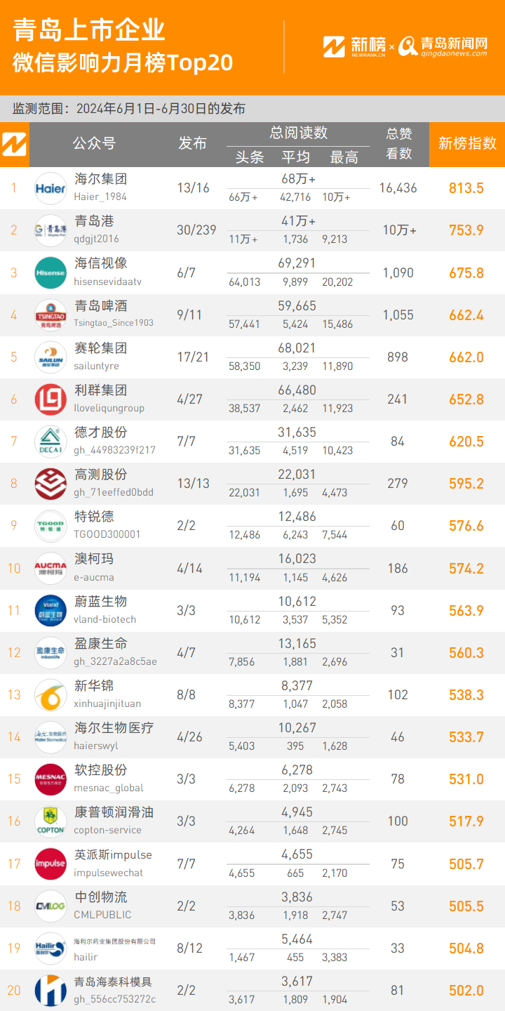 NO.1| 權(quán)威發(fā)布:2024年青島上市企業(yè)微信影響力月度排行榜TOP20