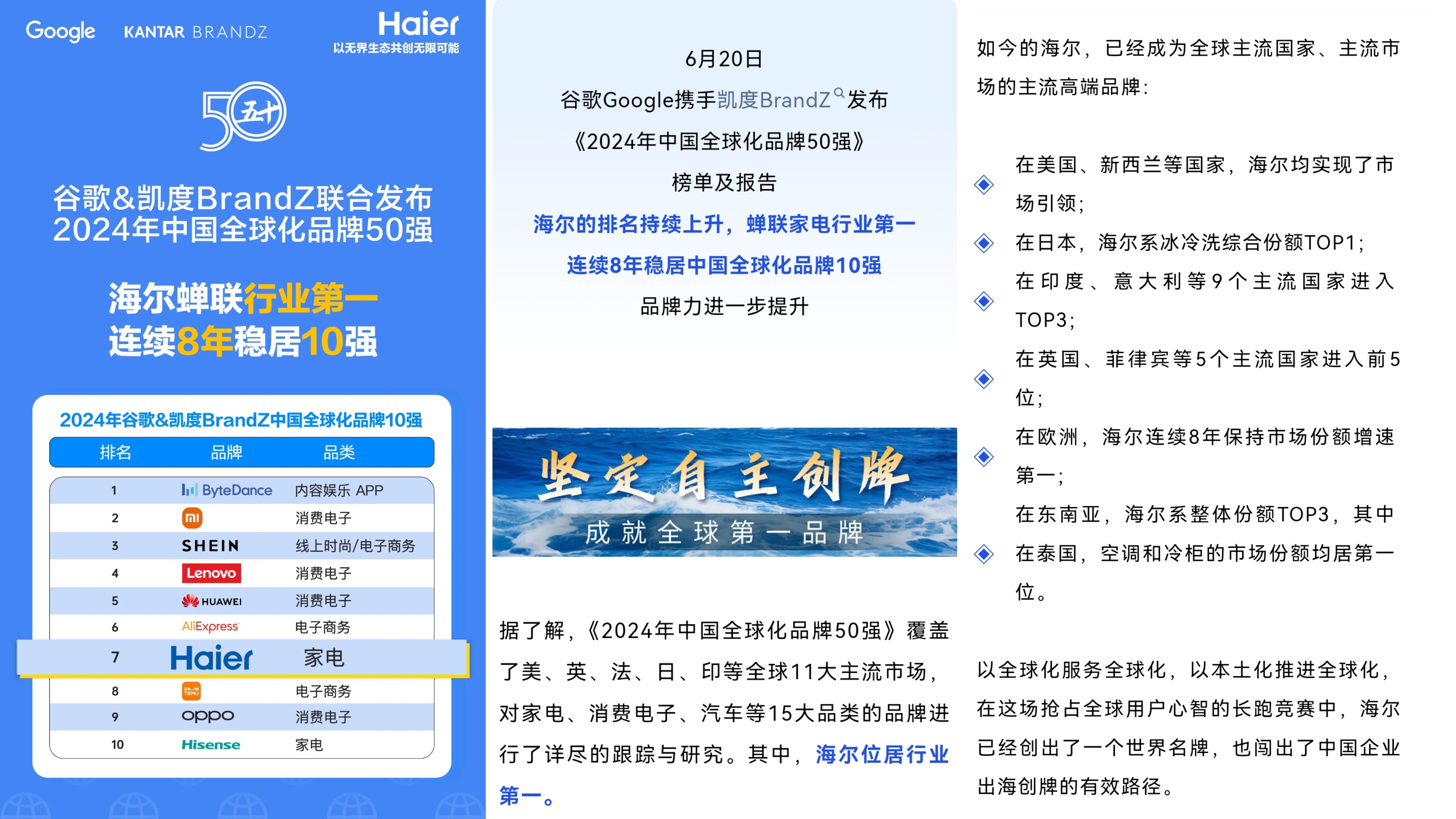 2024中國(guó)全球化品牌50強(qiáng)揭榜!海爾蟬聯(lián)行業(yè)第一,穩(wěn)居十強(qiáng)