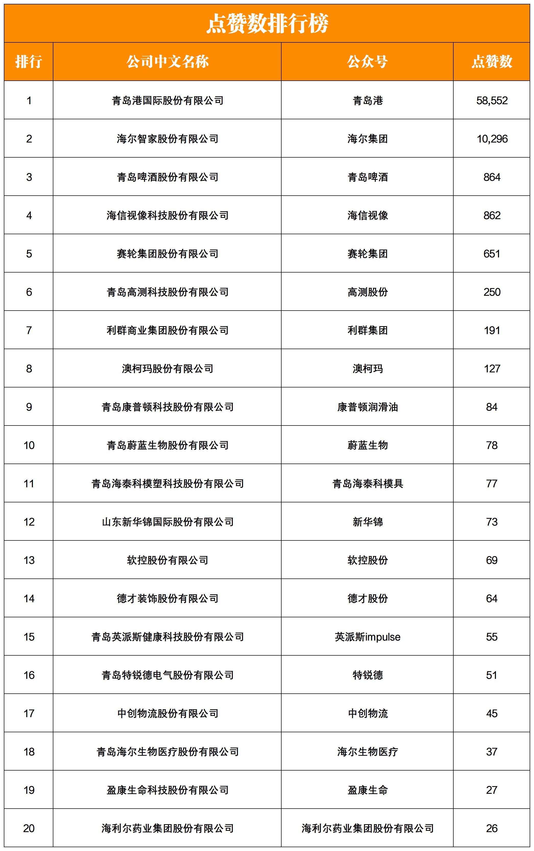 本期登上分榜單總點(diǎn)贊數(shù)前三的青島上市企業(yè)是:“青島港”、“海爾集團(tuán)”、“青島啤酒”。