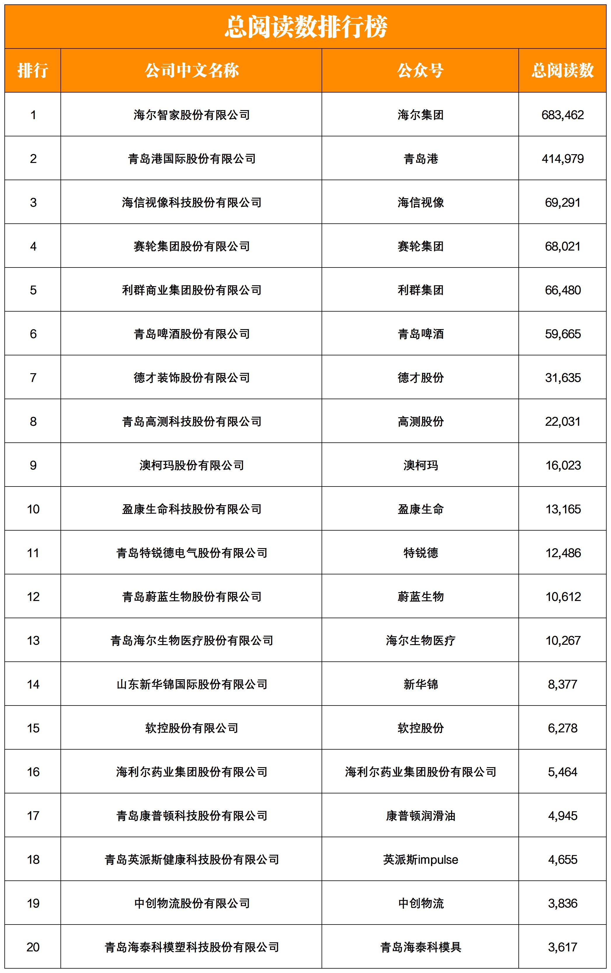 NO.1| 權(quán)威發(fā)布:青島上市企業(yè)微信影響力月度排行榜TOP20