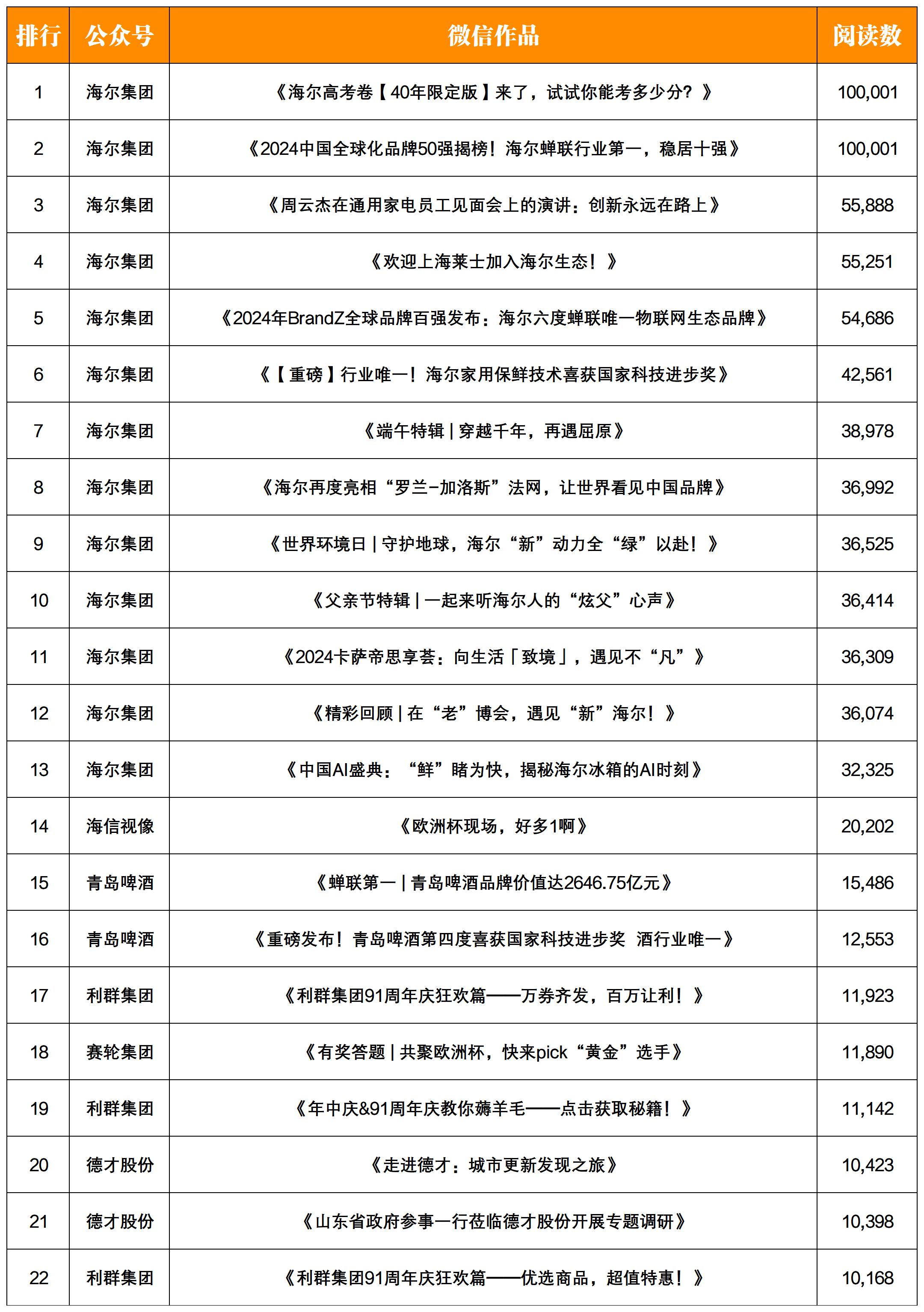 熱文方面,“海爾集團(tuán)”的《海爾高考卷【40年限定版】來(lái)了,試試你能考多少分?》和《2024中國(guó)全球化品牌50強(qiáng)揭榜!海爾蟬聯(lián)行業(yè)第一,穩(wěn)居十強(qiáng)》兩篇文章均喜提10w+閱讀。