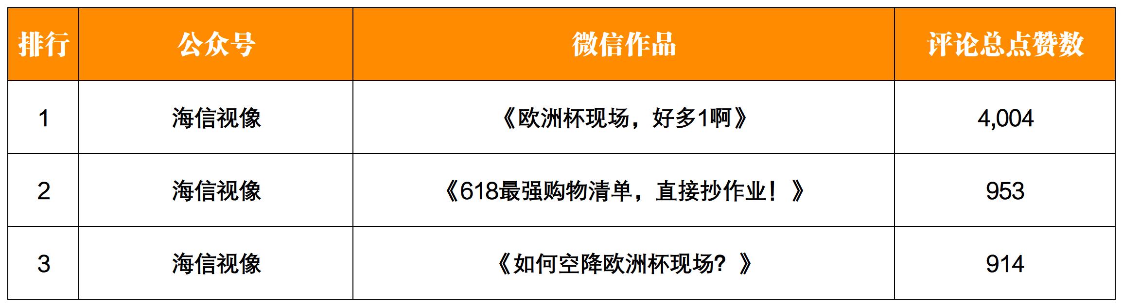 本期單篇作品最高評(píng)論總點(diǎn)贊數(shù)4004,出自賬號(hào)“海信視像”的《歐洲杯現(xiàn)場(chǎng),好多1啊》一文;排行第二、第三也均出自賬號(hào)“海信視像”的《618最強(qiáng)購(gòu)物清單,直接抄作業(yè)!》一文和《如何空降歐洲杯現(xiàn)場(chǎng)?》一文,評(píng)論總點(diǎn)贊數(shù)分別是963和914,數(shù)據(jù)比上一期有所提升。