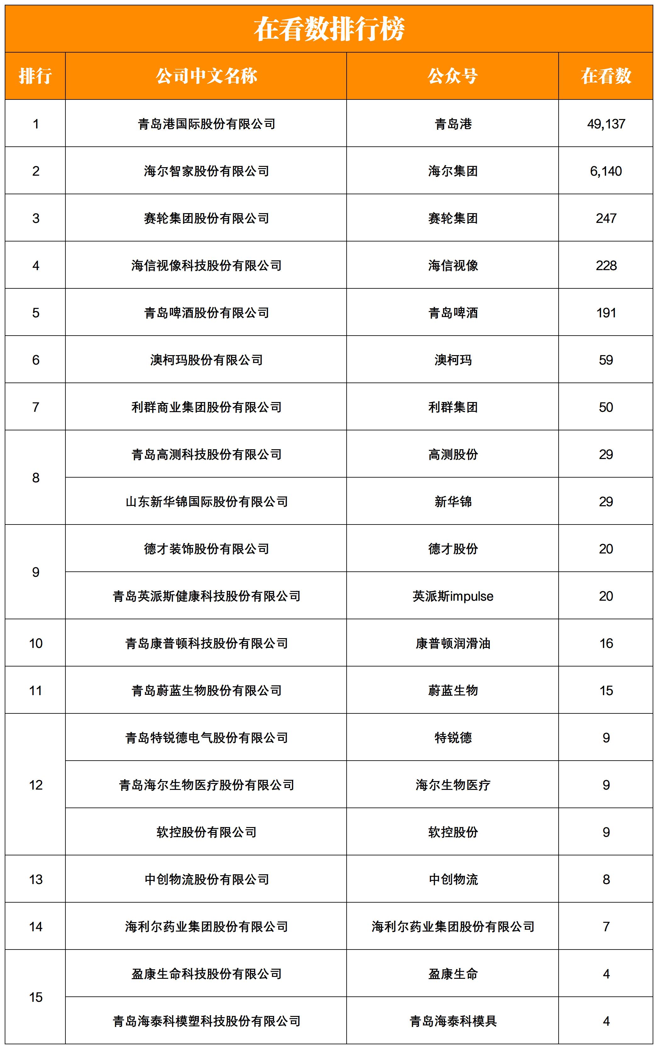 本期登上分榜單總在看數(shù)前三的青島上市企業(yè)是:“青島港”、“海爾集團(tuán)”、“賽輪集團(tuán)”。
