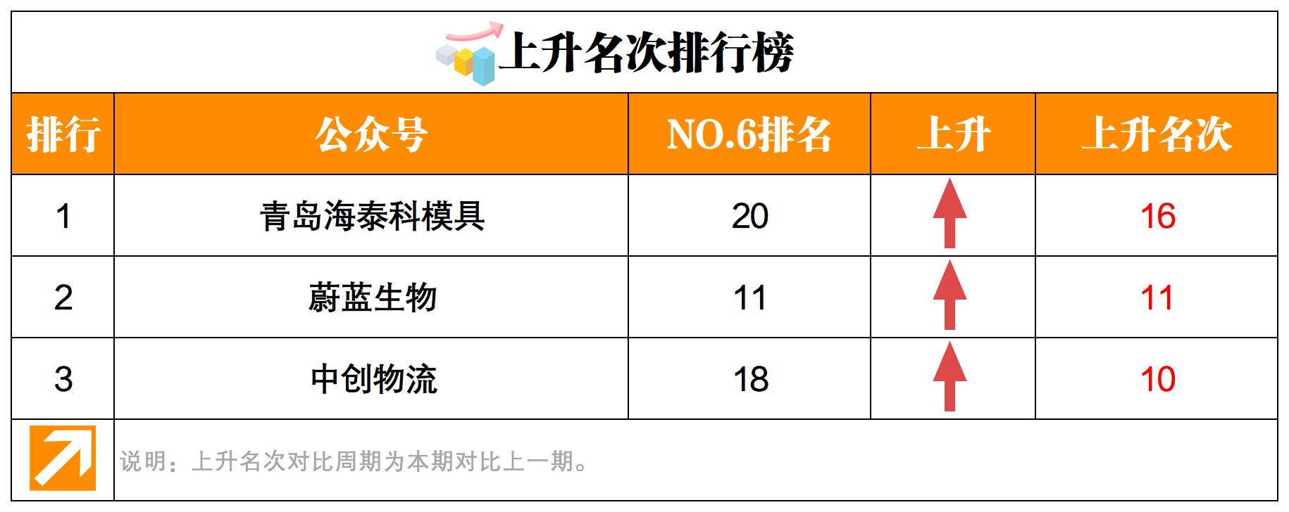 本期上升名次排行榜前三名分別是:“青島海泰科模具”、“蔚藍(lán)生物”、“中創(chuàng)物流”。