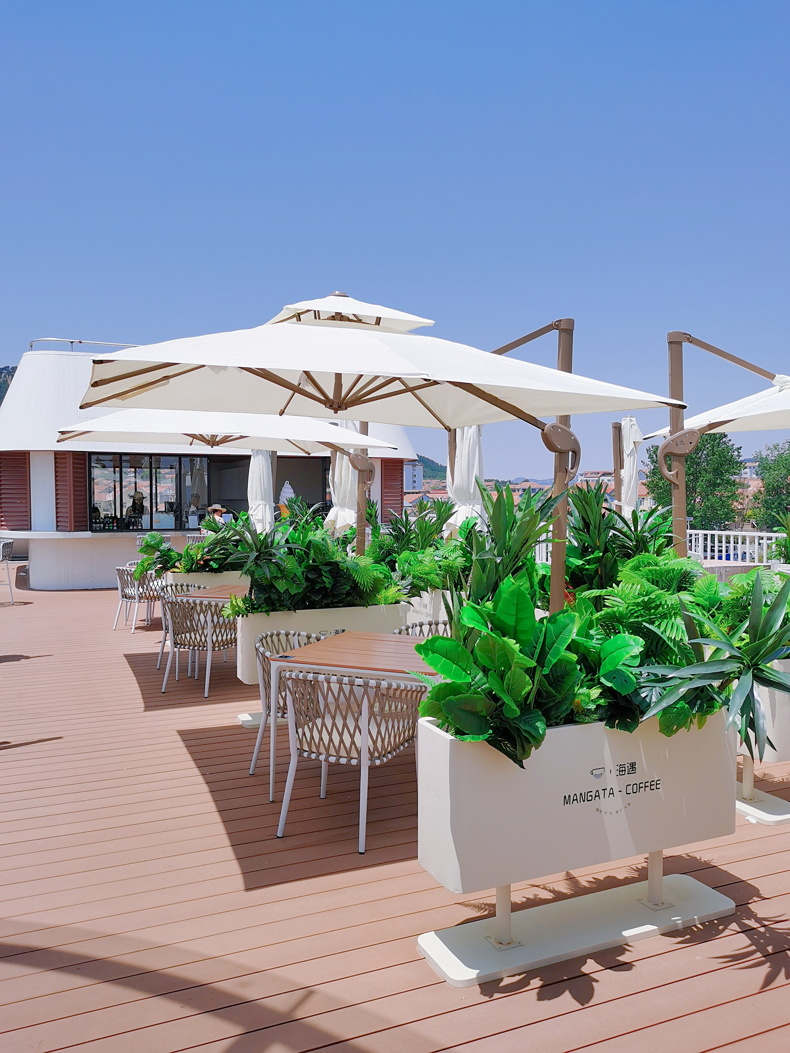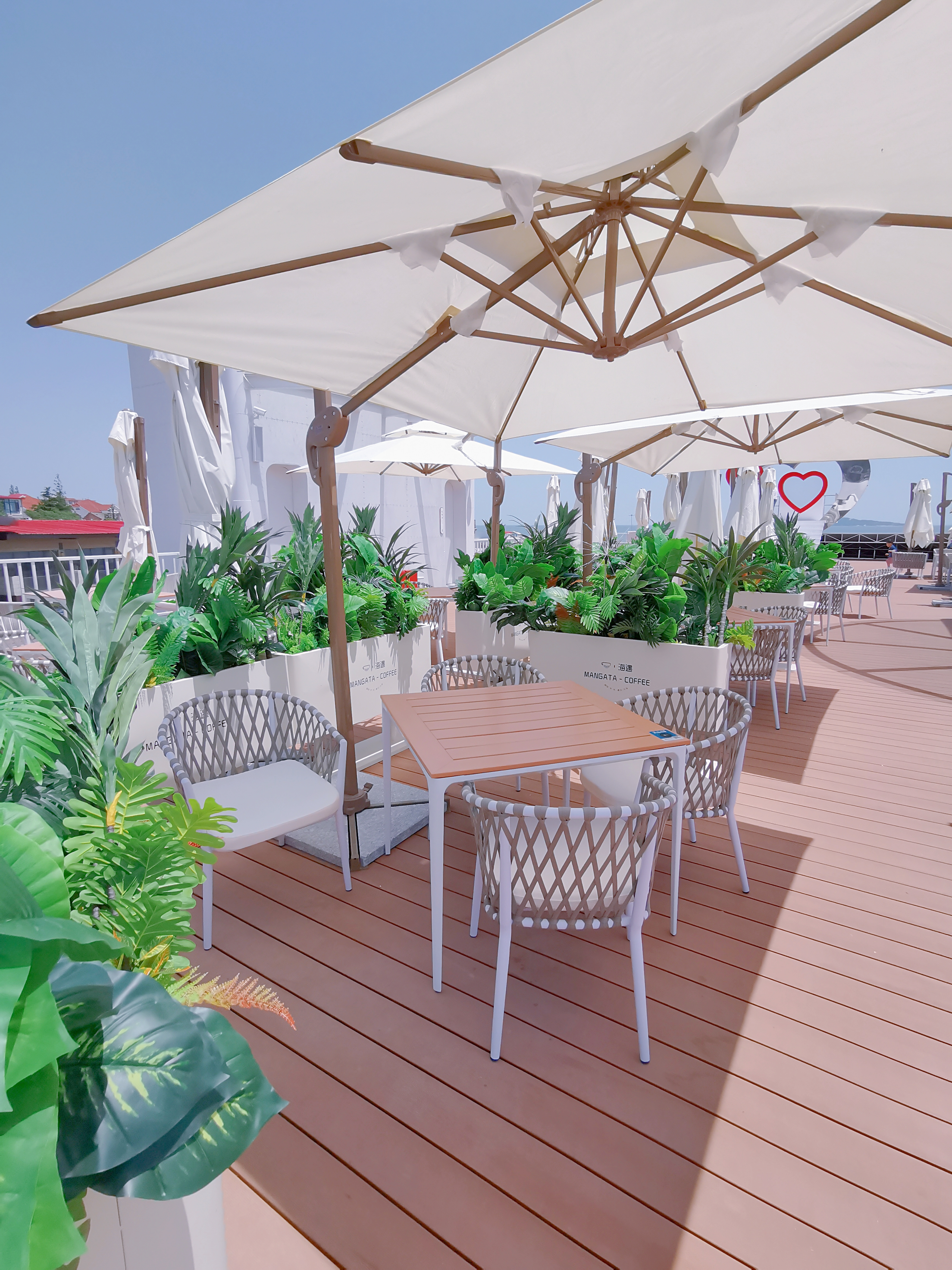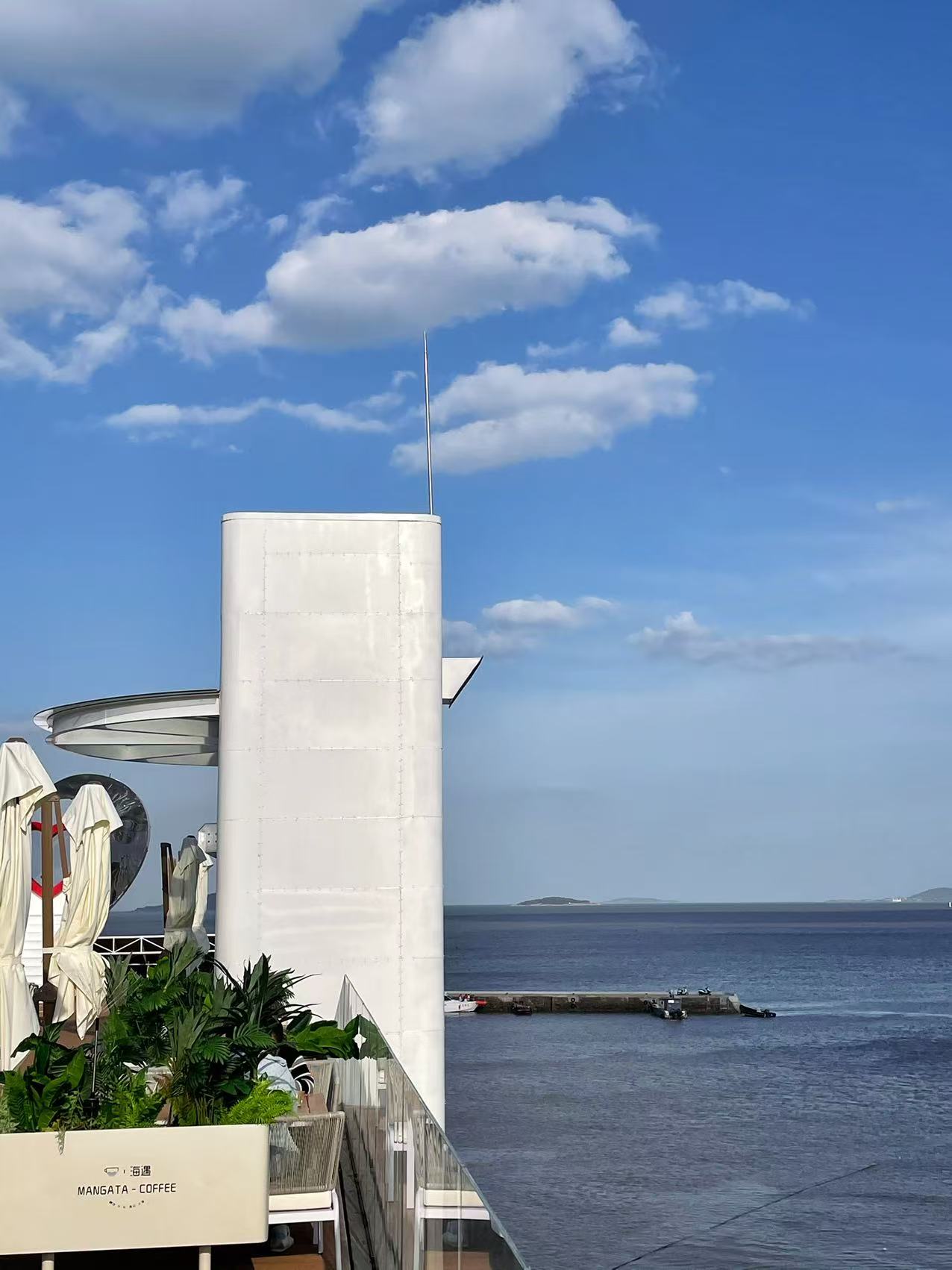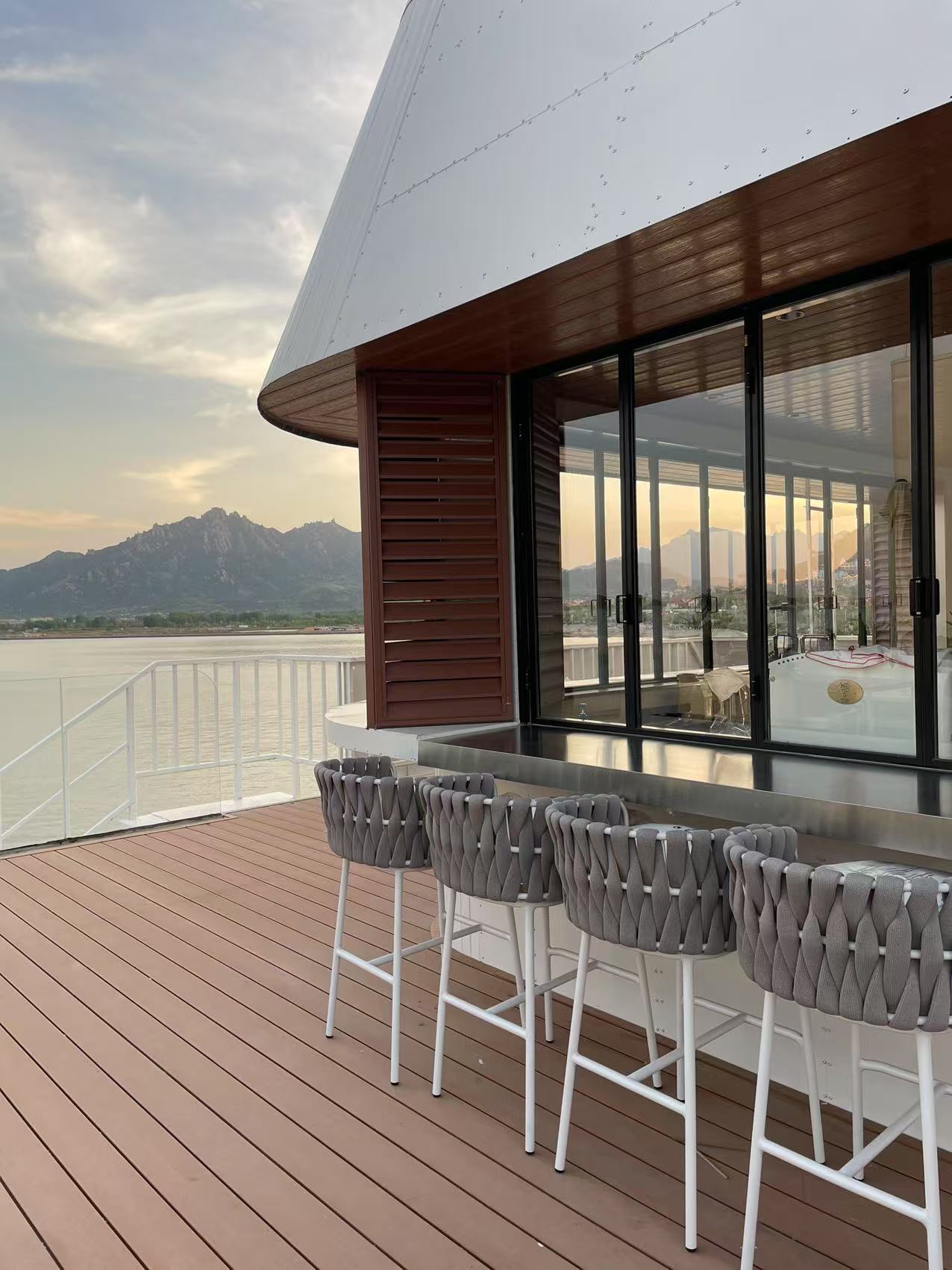 咖啡館位于會海灣,這里風(fēng)光絕美,一半是海,一半是山。向東眺望,無垠的海面波光粼粼;向西遠(yuǎn)觀,層巒疊嶂的嶗山云霧繚繞;站在甲板上,眼前是一望無際的碧波,遠(yuǎn)處是連綿起伏的嶗山,日出時觀海,日落時望山,仿佛時間都慢了下來。