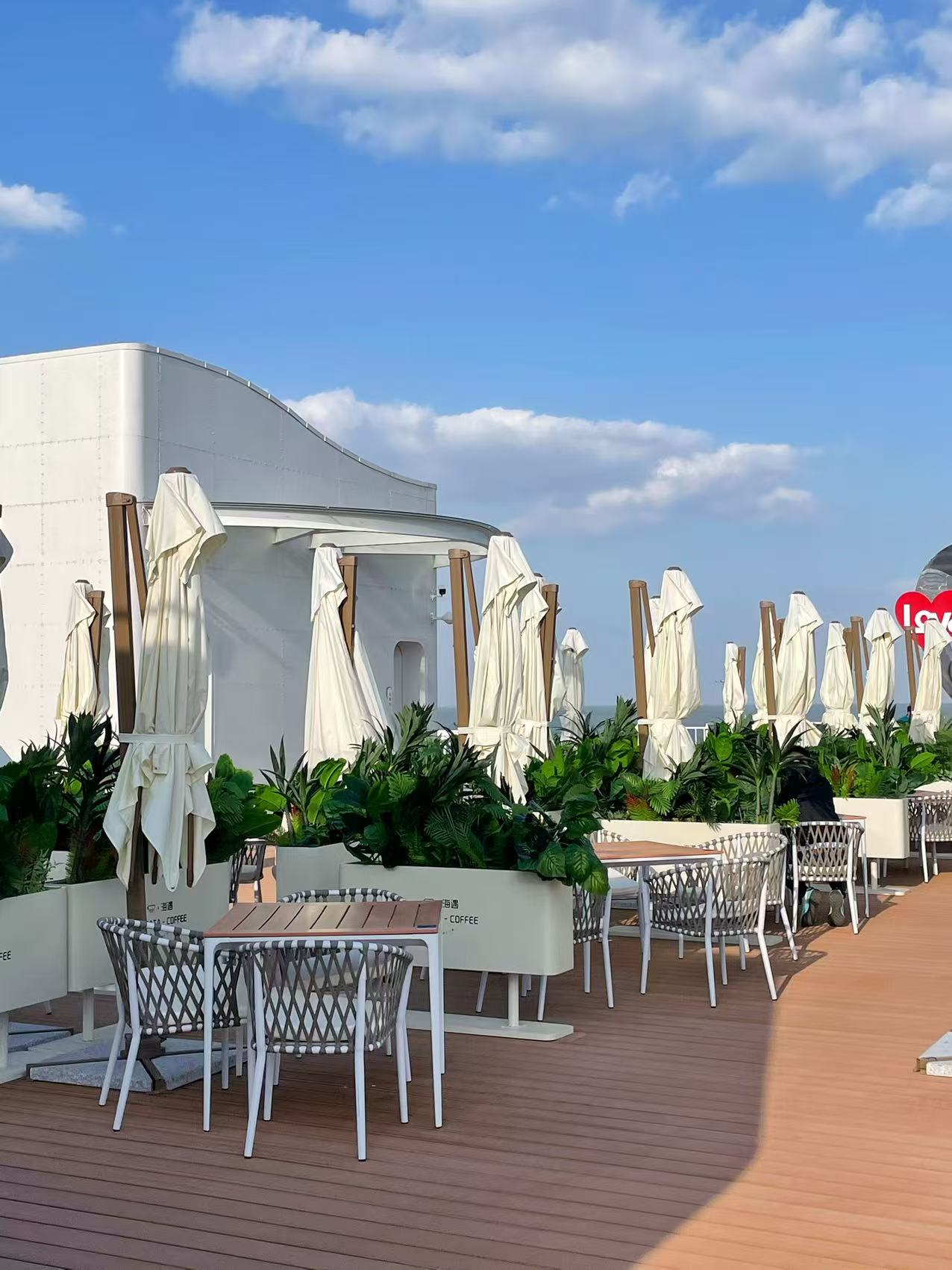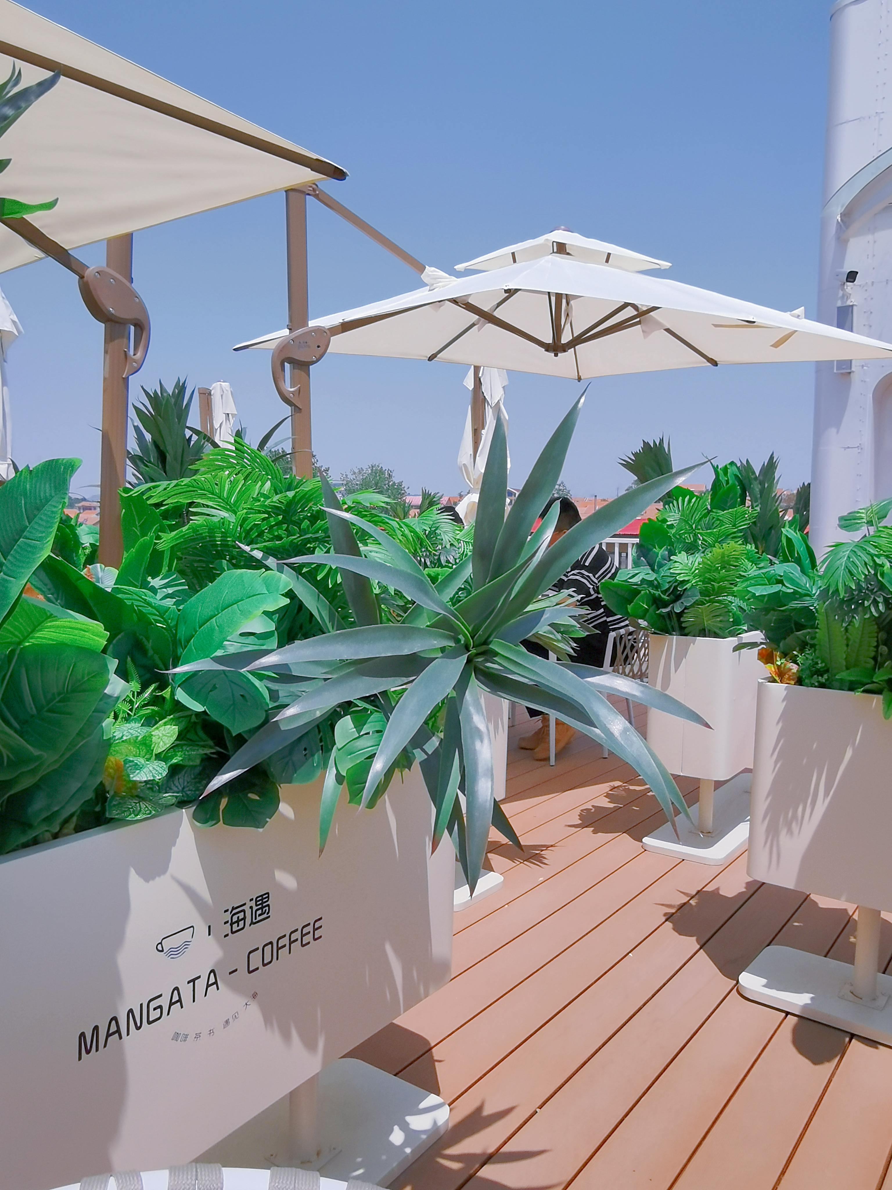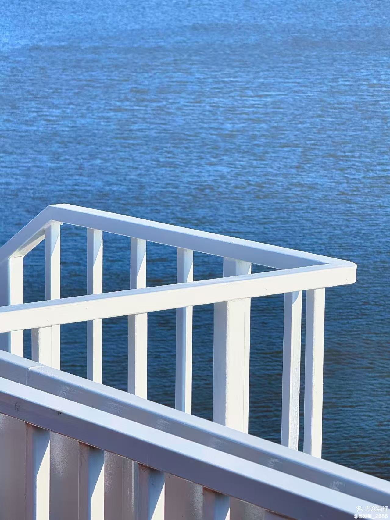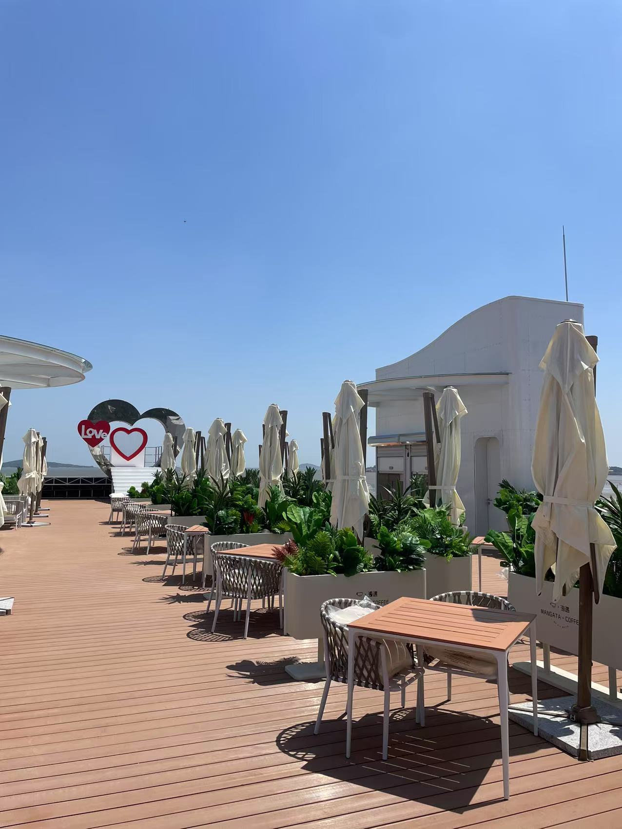 咖啡館位于會海灣,這里風(fēng)光絕美,一半是海,一半是山。向東眺望,無垠的海面波光粼粼;向西遠(yuǎn)觀,層巒疊嶂的嶗山云霧繚繞;站在甲板上,眼前是一望無際的碧波,遠(yuǎn)處是連綿起伏的嶗山,日出時觀海,日落時望山,仿佛時間都慢了下來。