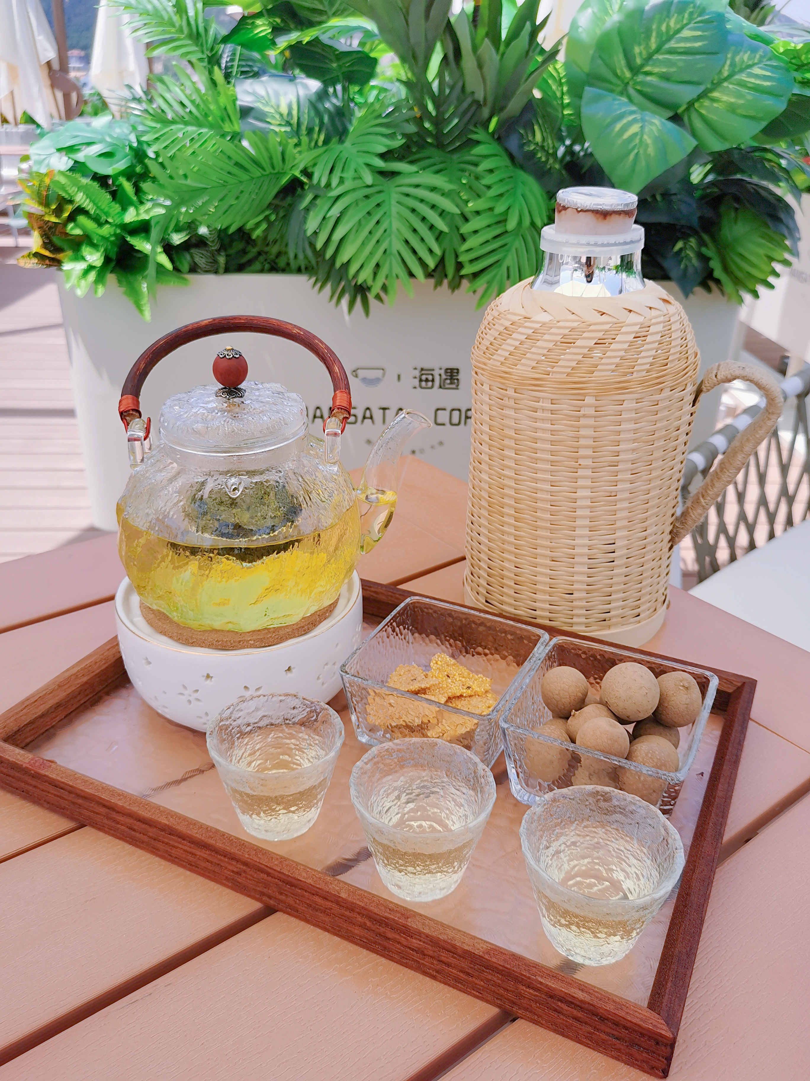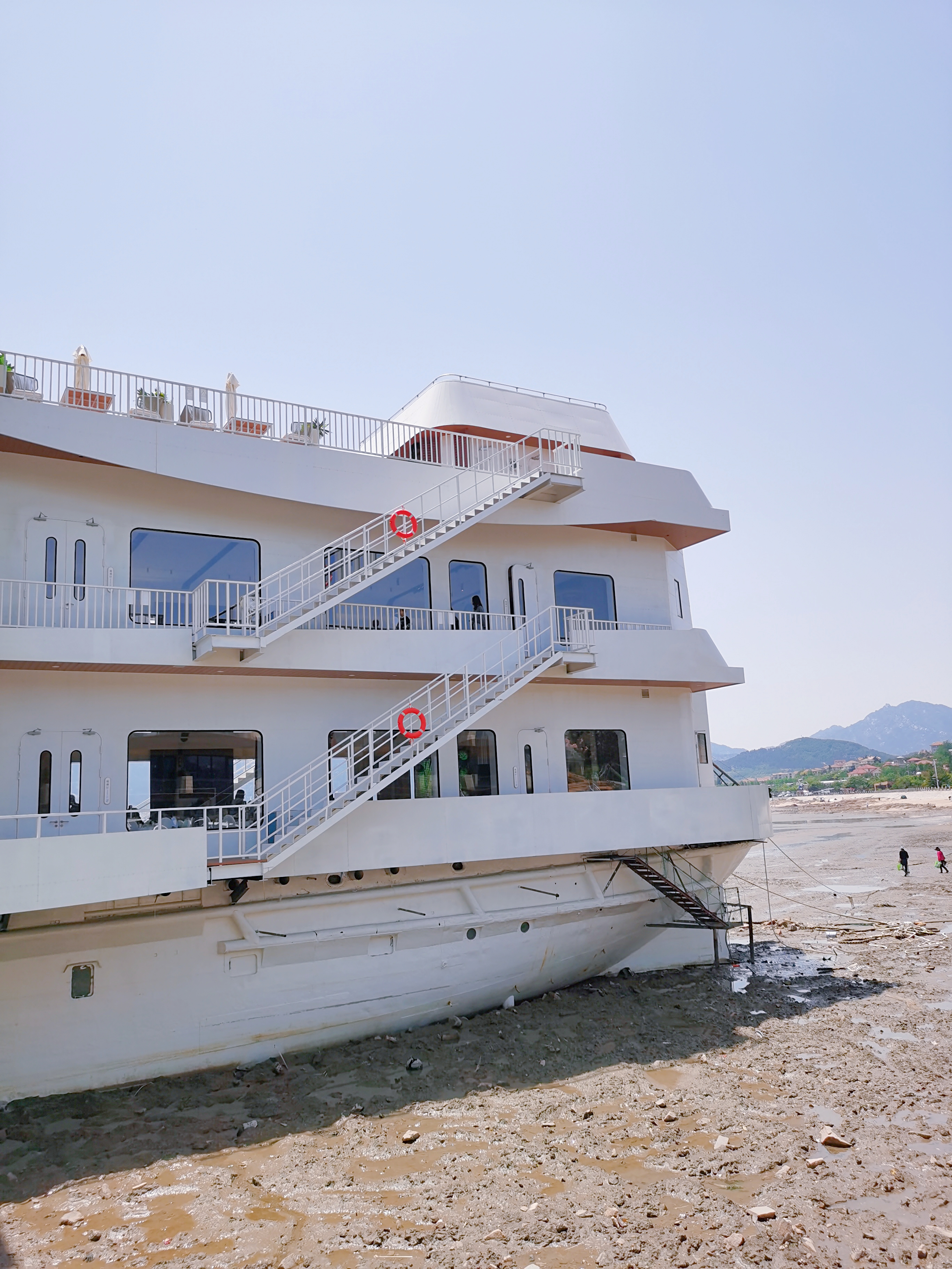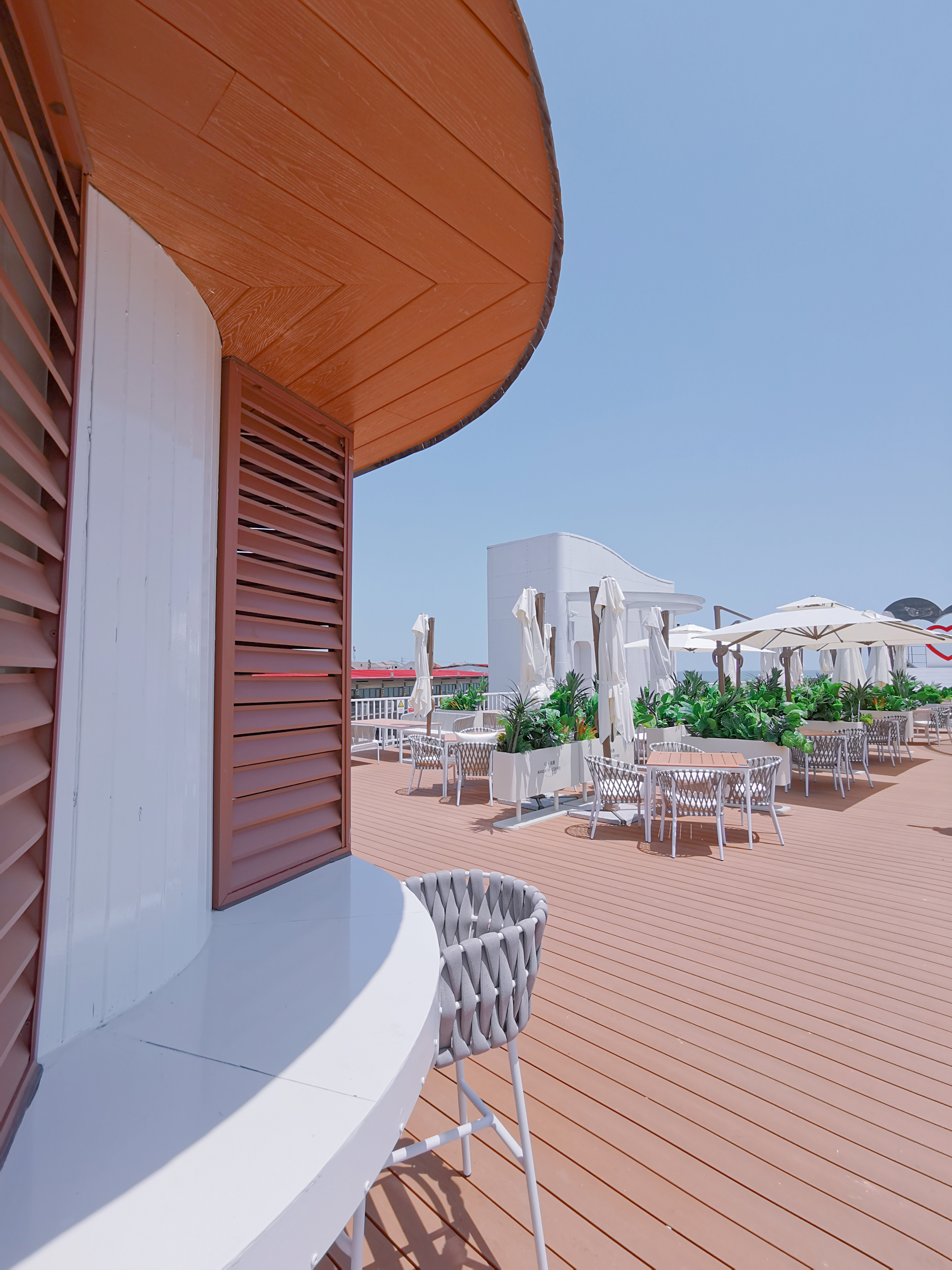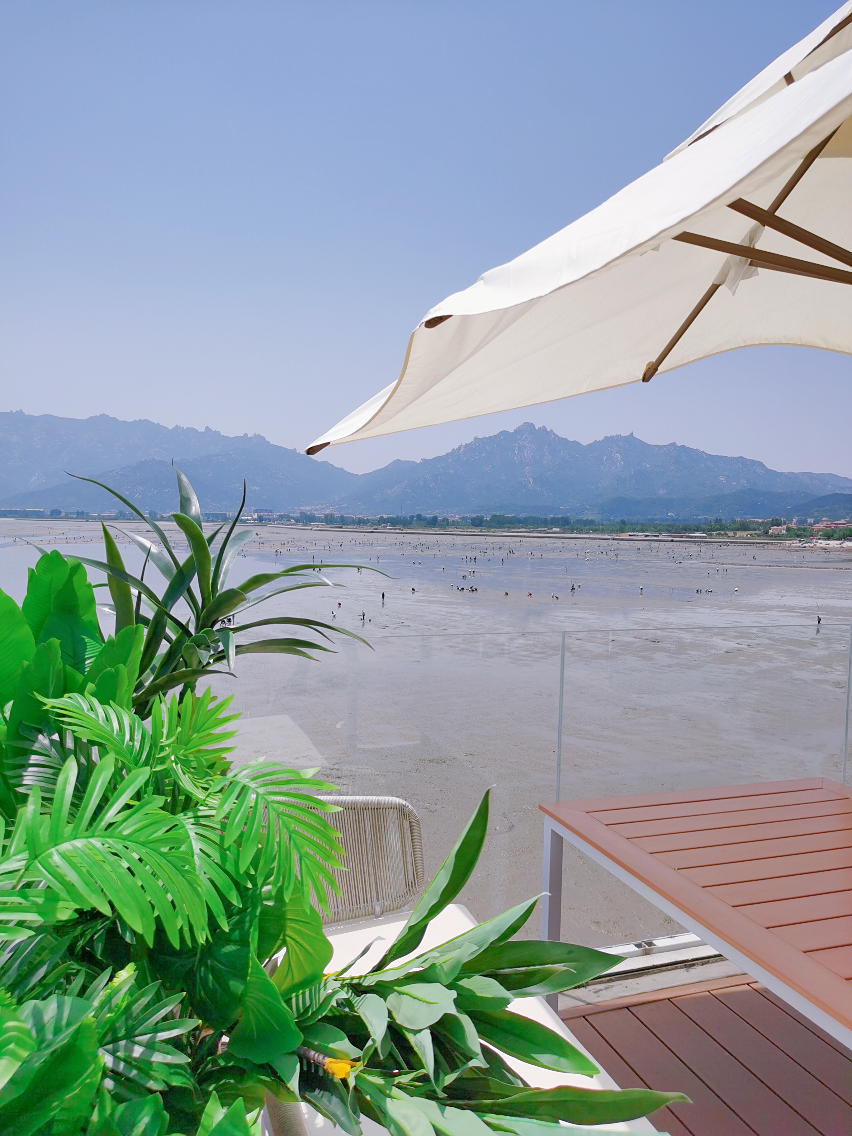 咖啡館位于會海灣,這里風(fēng)光絕美,一半是海,一半是山。向東眺望,無垠的海面波光粼粼;向西遠(yuǎn)觀,層巒疊嶂的嶗山云霧繚繞;站在甲板上,眼前是一望無際的碧波,遠(yuǎn)處是連綿起伏的嶗山,日出時觀海,日落時望山,仿佛時間都慢了下來。